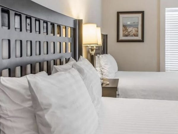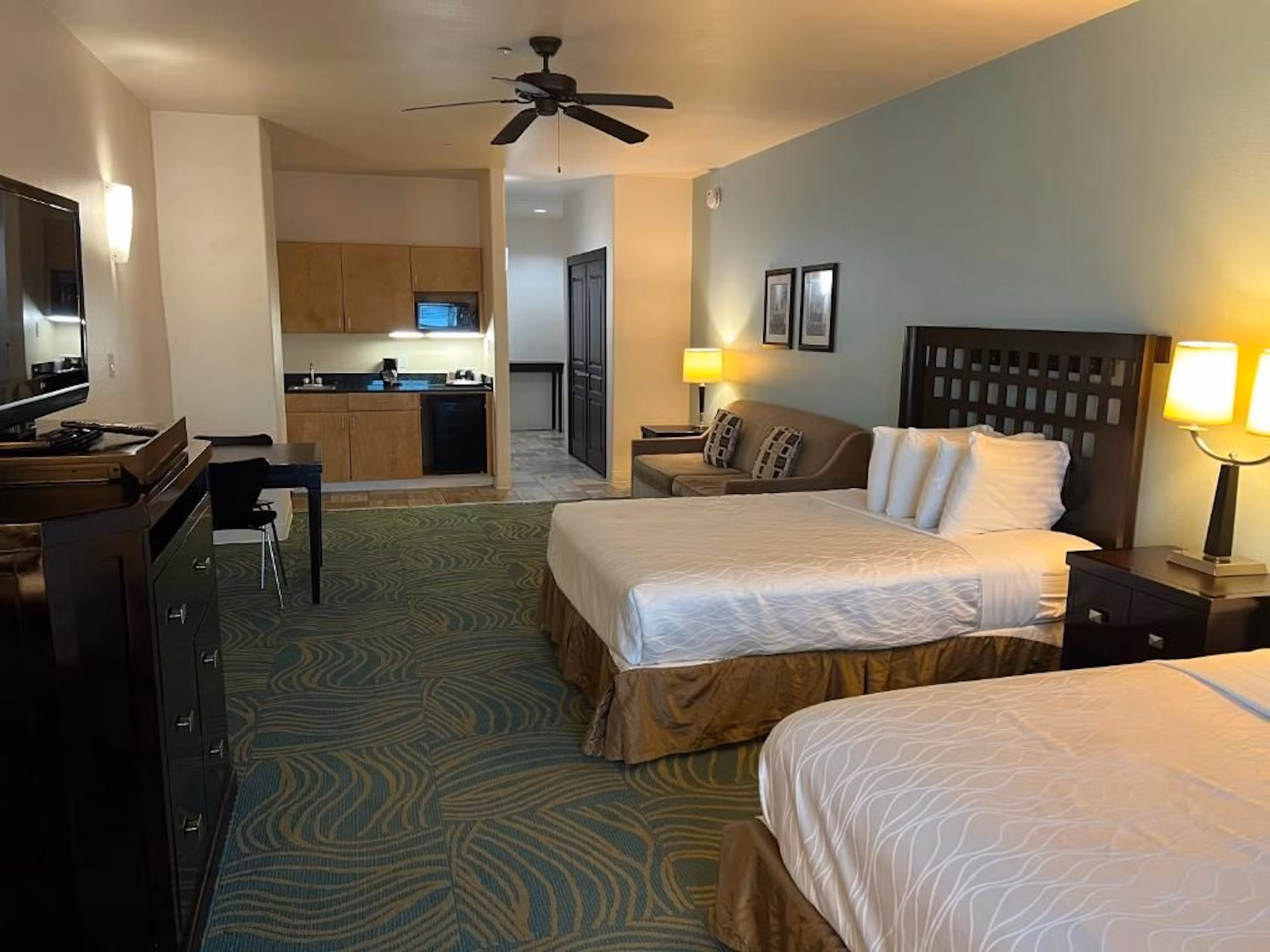 This suite has a sitting space with a flat-screen cable TV. There is also a microwave and a coffee maker available.