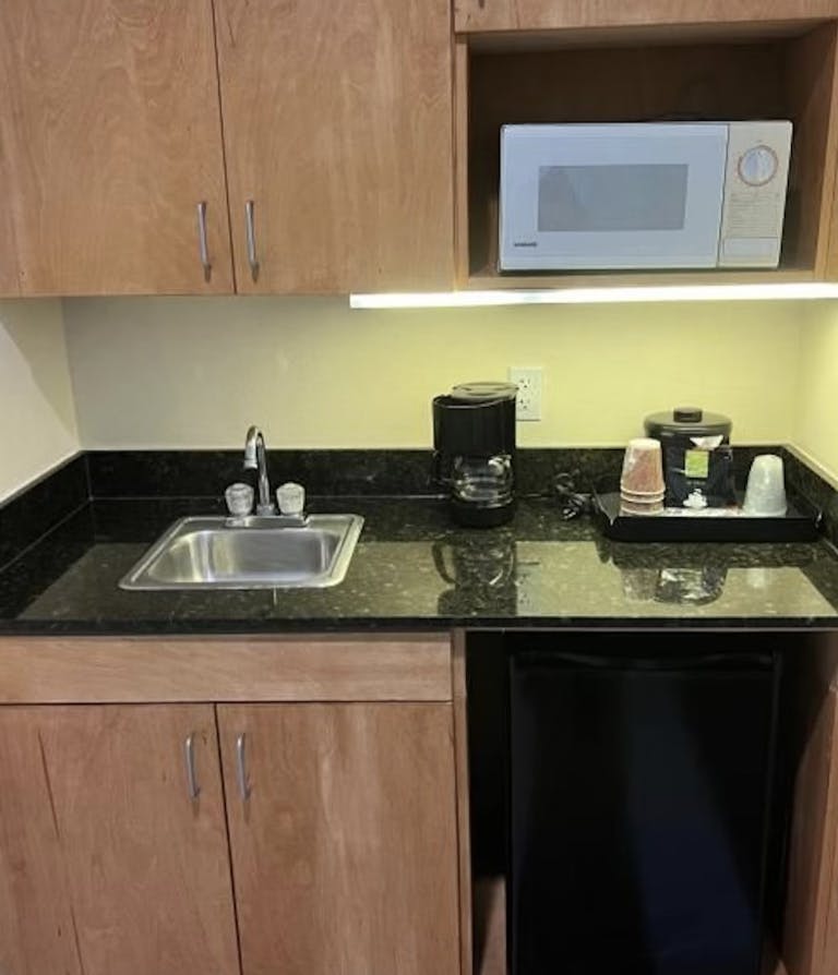 This suite has a sitting space with a flat-screen cable TV. There is also a microwave and a coffee maker available.